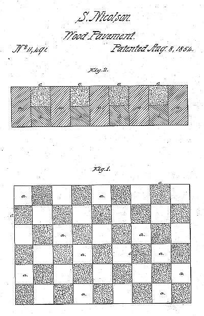 The specific type of pavement settled on by the road builders in 1863 was the newly patented Nicholson Pavement. This featured coal tar soaked blocks of wood, which were less prone to rotting. Patented Aug 8th, 1854 by Samuel Nicholson, this was the most popular form of woodblock pavement in the 19th century. As the process for creating it was still under patent, the builders had to obtain local rights from the American Nicholson Pavement Co. . This company was later subject to a Supreme Court Case, City of Elizabeth v. American Nicholson Pavement Co. , which ruled that although public use of an invention a year before a patent application usually made the invention ineligible for a patent, this did not apply to cases where the invention was being used by the public for testing purposes. Samuel Nicholson’s laying of a test stretch of pavement along a turnpike to allow the public to test it was ruled not be the sort of use which would otherwise bar him from patenting the process, on the basis there was no other practical way to test a paving technique.